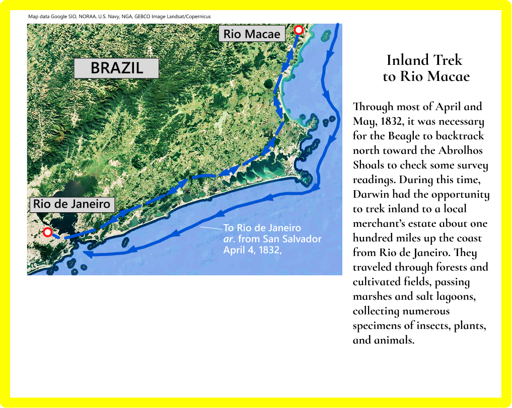 Rio de Janeiro— Excursion north of Cape Frio— Great Evaporation— Slavery— Botofogo Bay— Terrestrial Planariae— Clouds on the Corcovado— Heavy Rain— Musical Frogs— Phosphorescent Insects— Elater, springing powers of— Blue Haze— Noise made by a Butterfly— Entomology— Ants— Wasp killing a Spider— Parasitical Spider— Artifices of an Epeira— Gregarious Spider— Spider with an unsymmetrical Web.