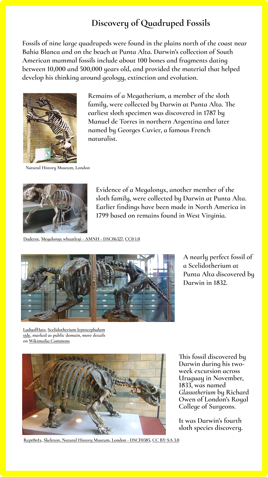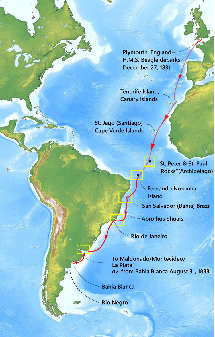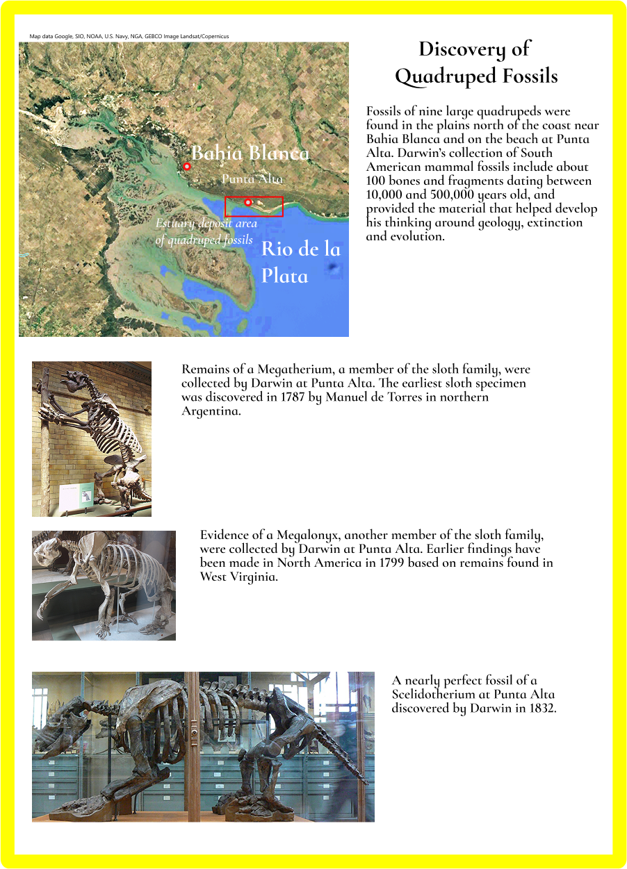 The plain, at the distance of a few miles from the coast, belongs to the great Pampean formation, which consists in part of a reddish clay, and in part of a highly calcareous marly rock. Nearer the coast there are some plains formed from the wreck of the upper plain, and from mud, gravel, and sand thrown up by the sea during the slow elevation of the land, of which elevation we have evidence in upraised beds of recent shells, and in rounded pebbles of pumice scattered over the country. At Punta Alta we have a section of one of these later-formed little plains, which is highly interesting from the number and extraordinary character of the remains of gigantic land-animals embedded in it. These have been fully described by Professor Owen, in the Zoology of the voyage of the Beagle, and are deposited in the College of Surgeons. I will here give only a brief outline of their nature. [ See Route Detail at right => ]
