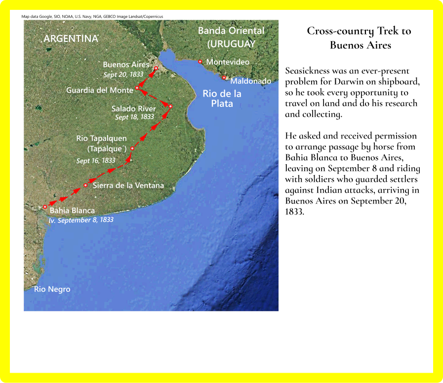 SEPTEMBER 18th. [Correction: 8th [See notes - Editor] ] — I hired a Gaucho to accompany me on my ride to Buenos Ayres [ See Route Detail at right => ], though with some difficulty, as the father of one man was afraid to let him go, and another, who seemed willing, was described to me as so fearful, that I was afraid to take him, for I was told that even if he saw an ostrich at a distance, he would mistake it for an Indian, and would fly like the wind away. The distance to Buenos Ayres is about four hundred miles, and nearly the whole way through an uninhabited country. We started early in the morning; ascending a few hundred feet from the basin of green turf on which Bahia Blanca stands, we entered on a wide desolate plain. It consists of a crumbling argillaceo-calcareous rock, which, from the dry nature of the climate, supports only scattered tufts of withered grass, without a single bush or tree to break the monotonous uniformity. The weather was fine, but the atmosphere remarkably hazy; I thought the appearance foreboded a gale, but the Gauchos said it was owing to the plain, at some great distance in the interior, being on fire. After a long gallop, having changed horses twice, we reached the Rio Sauce: it is a deep, rapid, little stream, not above twenty-five feet wide. The second posta on the road to Buenos Ayres stands on its banks, a little above there is a ford for horses, where the water does not reach to the horses' belly; but from that point, in its course to the sea, it is quite impassable, and hence makes a most useful barrier against the Indians.