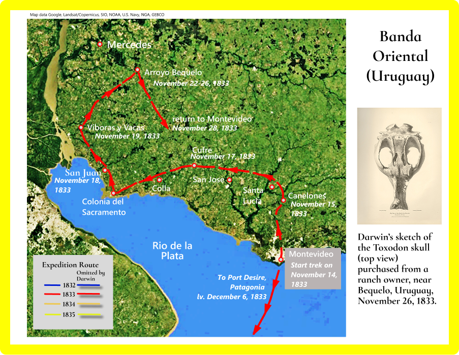 NOVEMBER 26th.— I set out on my return in a direct line for Monte Video. Having heard of some giant's bones at a neighbouring farm-house on the Sarandis, a small stream entering the Rio Negro, I rode there accompanied by my host, and purchased for the value of eighteen pence the head of the Toxodon. [4] [ See Route Detail at right => ] When found it was quite perfect; but the boys knocked out some of the teeth with stones, and then set up the head as a mark to throw at. By a most fortunate chance I found a perfect tooth, which exactly fitted one of the sockets in this skull, embedded by itself on the banks of the Rio Tercero, at the distance of about 180 miles from this place. I found remains of this extraordinary animal at two other places, so that it must formerly have been common. I found here, also, some large portions of the armour of a gigantic armadillo-like animal, and part of the great head of a Mylodon. The bones of this head are so fresh, that they contain, according to the analysis by Mr. T. Reeks, seven per cent of animal matter; and when placed in a spirit-lamp, they burn with a small flame. The number of the remains embedded in the grand estuary deposit which forms the Pampas and covers the granitic rocks of Banda Oriental, must be extraordinarily great. I believe a straight line drawn in any direction through the Pampas would cut through some skeleton or bones. Besides those which I found during my short excursions, I heard of many others, and the origin of such names as "the stream of the animal," "the hill of the giant," is obvious. At other times I heard of the marvellous property of certain rivers, which had the power of changing small bones into large; or, as some maintained, the bones themselves grew. As far as I am aware, not one of these animals perished, as was formerly supposed, in the marshes or muddy river-beds of the present land, but their bones have been exposed by the streams intersecting the subaqueous deposit in which they were originally embedded. We may conclude that the whole area of the Pampas is one wide sepulchre of these extinct gigantic quadrupeds.