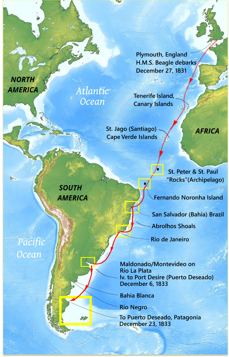 [ Editor's Note E : 1834 voyages started January to San Julian, then down to the entrance of the Strait of Magellan at Tierra del Fuego, and over to the Falklands in March, 1834 (Chapter 9). The Beagle returned to Santa Cruz, Patagonia, in April, 1834, then in May, 1834, sailed again to the entrance of the Strait of Magellan (Chapter 11).