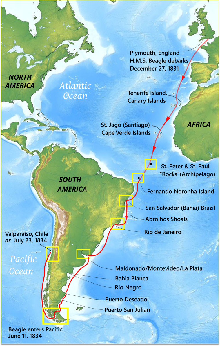 August 14th.— [ See Route Detail at right => ] I set out on a riding excursion, for the purpose of geologizing the basal parts of the Andes, which alone at this time of the year are not shut up by the winter snow. Our first day's ride was northward along the sea-coast. After dark we reached the Hacienda of Quintero, the estate which formerly belonged to Lord Cochrane. My object in coming here was to see the great beds of shells, which stand some yards above the level of the sea, and are burnt for lime. The proofs of the elevation of this whole line of coast are unequivocal: at the height of a few hundred feet old-looking shells are numerous, and I found some at 1300 feet. These shells either lie loose on the surface, or are embedded in a reddish-black vegetable mould. I was much surprised to find under the microscope that this vegetable mould is really marine mud, full of minute particles of organic bodies.