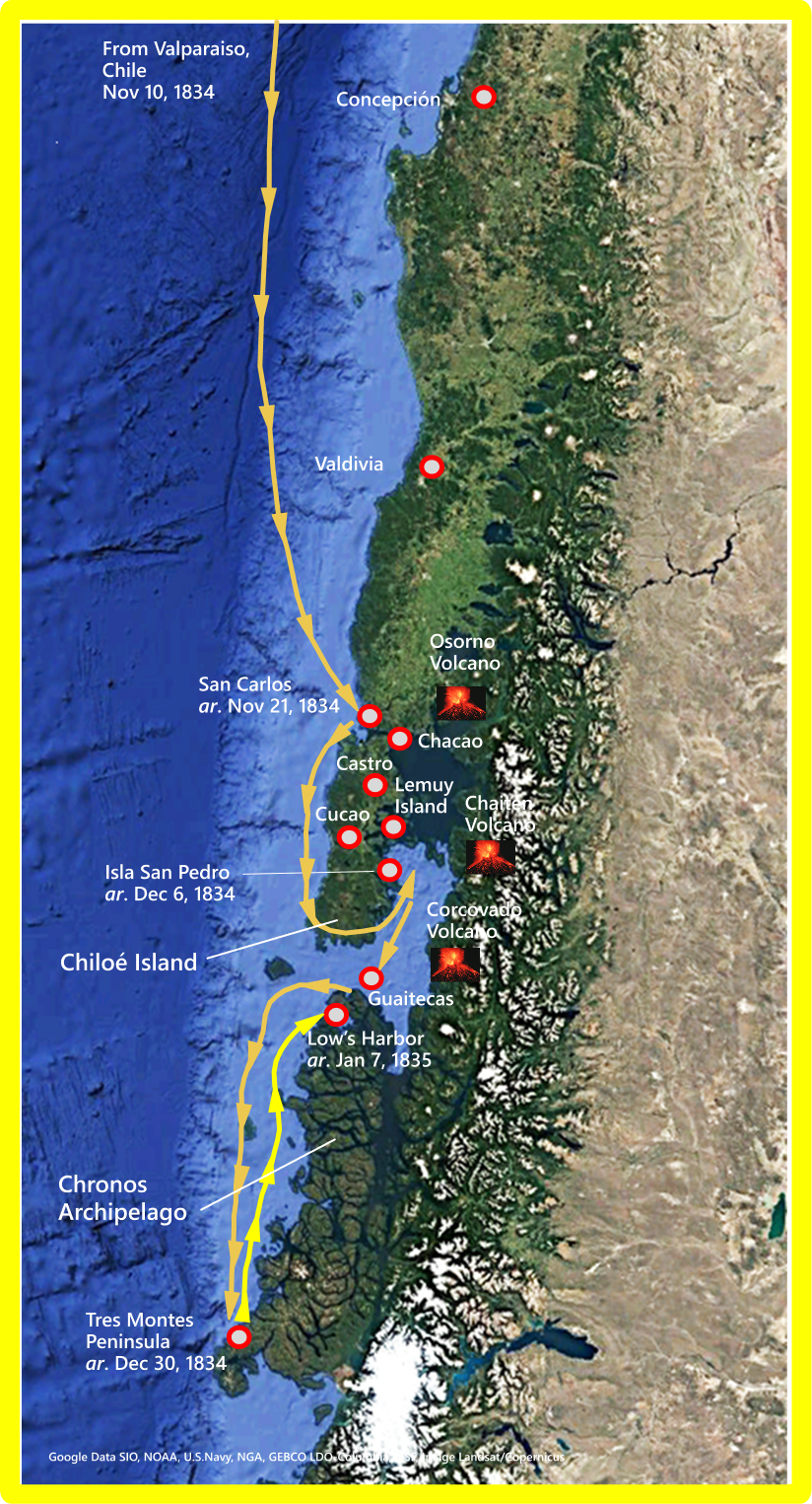 NOVEMBER 10th.— The Beagle sailed from Valparaiso to the south, for the purpose of surveying the southern part of Chile, the island of Chiloé, and the broken land called the Chonos Archipelago, as far south as the Peninsula of Tres Montes. On the 21st we anchored in the bay of S. Carlos, the capital of Chiloé.