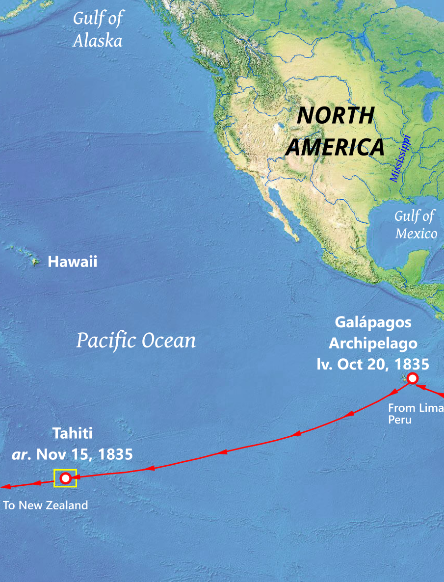 O CTOBER 20th.— The survey of the Galapagos Archipelago being concluded, we steered towards Tahiti and commenced our long passage of 3200 miles. In the course of a few days we sailed out of the gloomy and clouded ocean-district which extends during the winter far from the coast of South America. We then enjoyed bright and clear weather, while running pleasantly along at the rate of 150 or 160 miles a day before the steady trade-wind. The temperature in this more central part of the Pacific is higher than near the American shore. The thermometer in the poop cabin, by night and day, ranged between 80° and 83°, which feels very pleasant; but with one degree or two higher, the heat becomes oppressive. We passed through the Low or Dangerous Archipelago, and saw several of those most curious rings of coral land, just rising above the water's edge, which have been called Lagoon Islands. A long and brilliantly white beach is capped by a margin of green vegetation; and the strip, looking either way, rapidly narrows away in the distance, and sinks beneath the horizon From the mast-head a wide expanse of smooth water can be seen within the ring. These low hollow coral islands bear no proportion to the vast ocean out of which they abruptly rise; and it seems wonderful, that such weak invaders are not overwhelmed, by the all-powerful and never-tiring waves of that great sea, miscalled the Pacific.